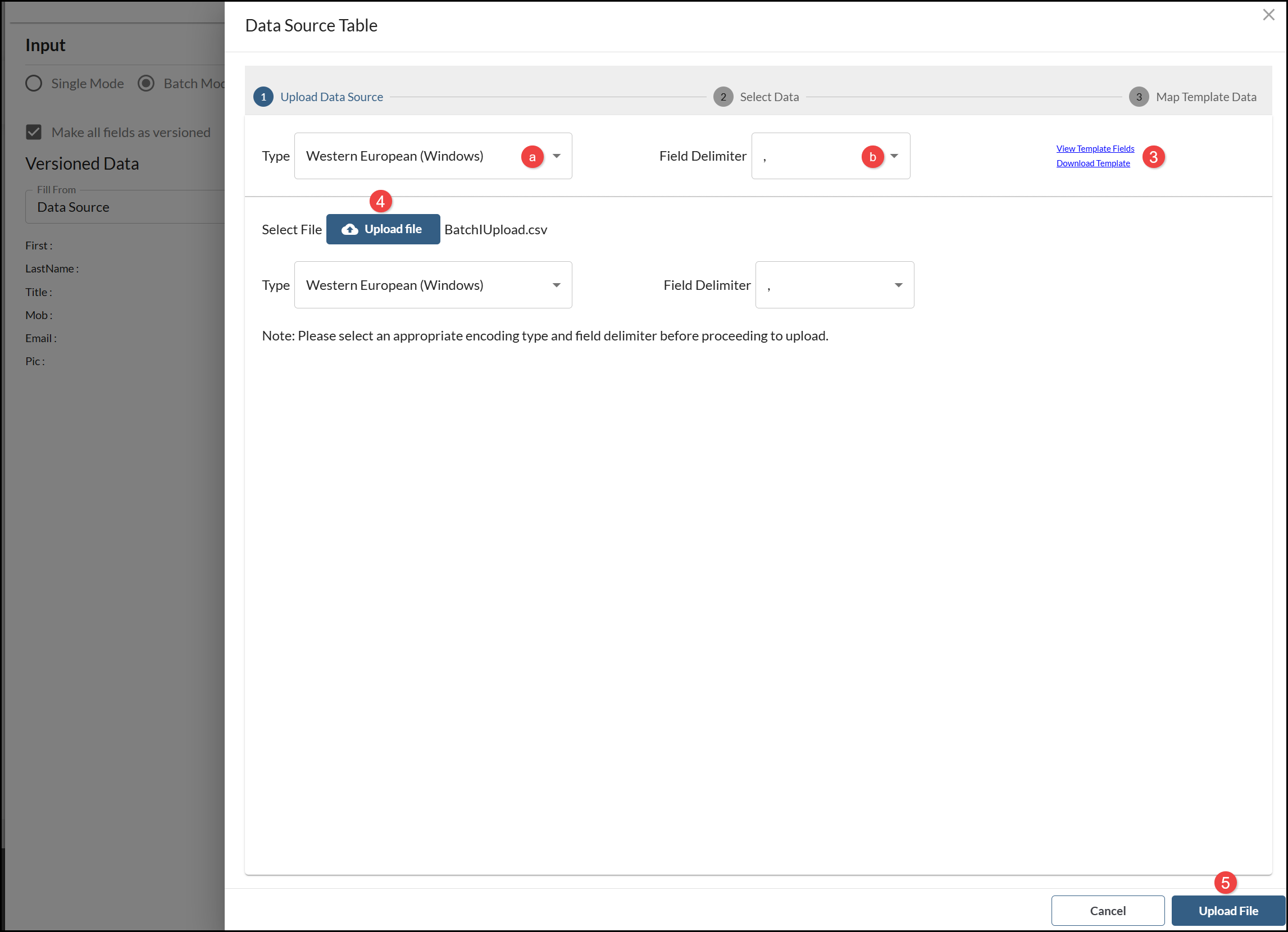 Products may also include an option to upload a Data Source. Select Batch Mode and: