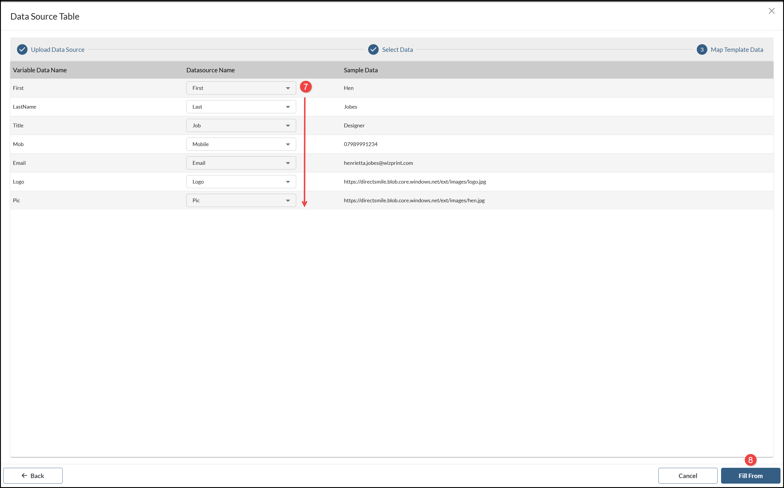 - Select the fields from the Datasource Name menu which Map to each of the Variable Data Name fields. The Sample Data displays the value from the selected record.